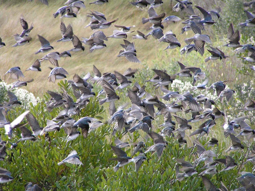 Tree swallows are short-distance migrators. They gather in large flocks in the fall. They are the first swallows to reappear in the spring.
