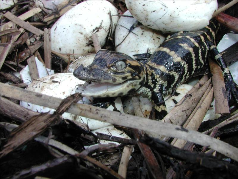 The eggs hatch in a little over a month. Right before the young begin to hatch, they start making a high-pitched squeaking or chucking sound. This lets the female know that it is time to take the vegetation off the eggs. The temperature of the nest can determine the sex of the hatchlings! If the nest is 82-86°F, the hatchlings will be females, if the nest is 90- 93°F all the hatchlings will be male! When the nest is between 82°F and 90°F, the hatchlings will be both male and female.