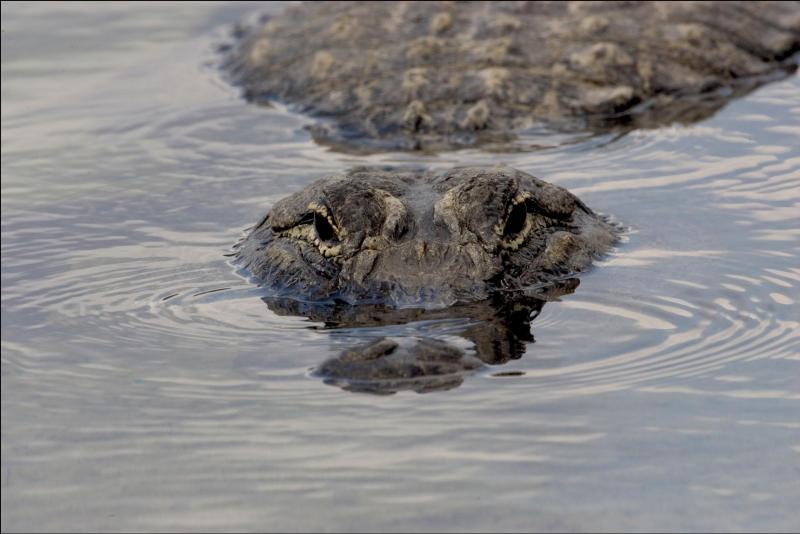 It has short, powerful legs and a long, round snout. (The American crocodile has a long, pointed snout.) Its eyes are on the top of its head. When the alligator is in the water, it can swim with just the top of its head above the water. This helps it sneak up on its prey. When the American alligator slips under the water, its nostrils and ears close up, and a membrane covers its eyes. Its long tail helps it move through the water.