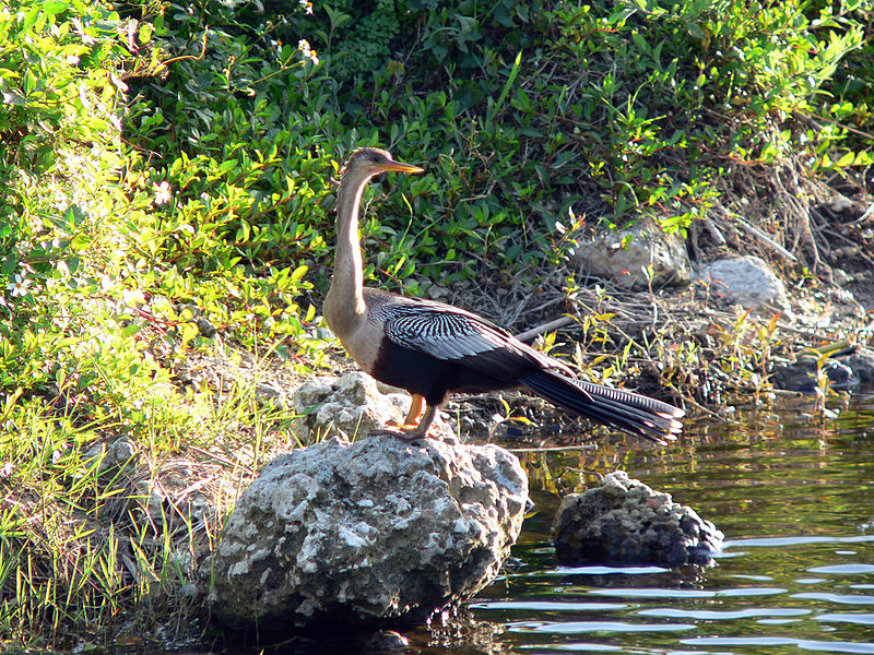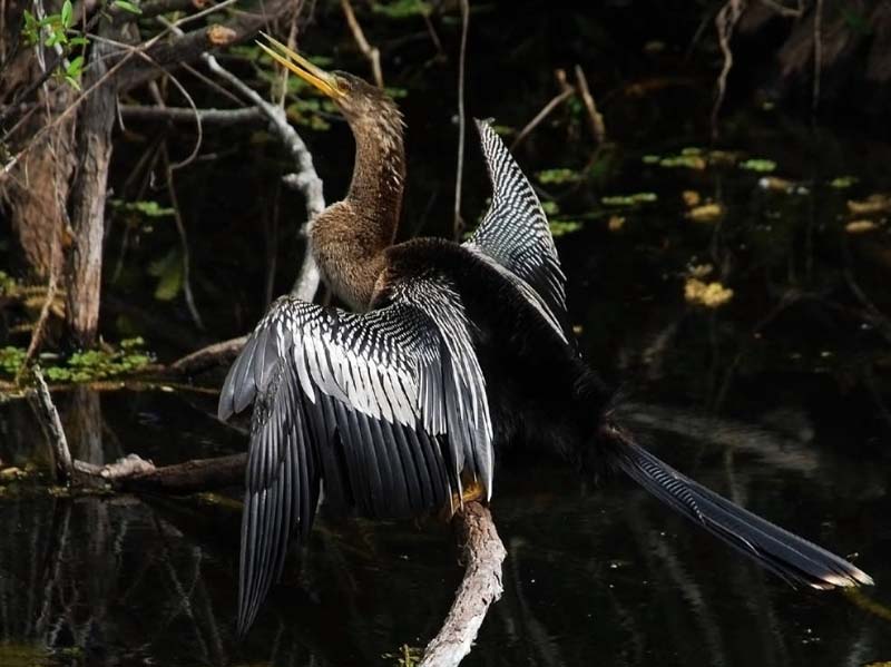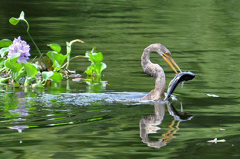 The anhinga is also known as the snakebird. When it swims, its body is submerged under the water. It stretches its head and neck flat out on the surface of the water. When its head and neck are stretched out, it looks like a snake is gliding through the water.