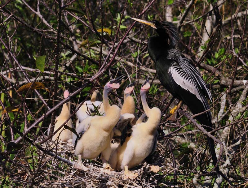 The male anhinga courts the female by flying and gliding overhead. The male chooses a nesting site. Once a pair has formed, the male gathers sticks, leaves, and twigs for the nest. The female uses the materials the male gathers to build a platform nest in a tree. The nest is built 4-20 feet above the ground or water.