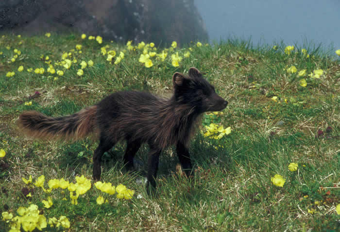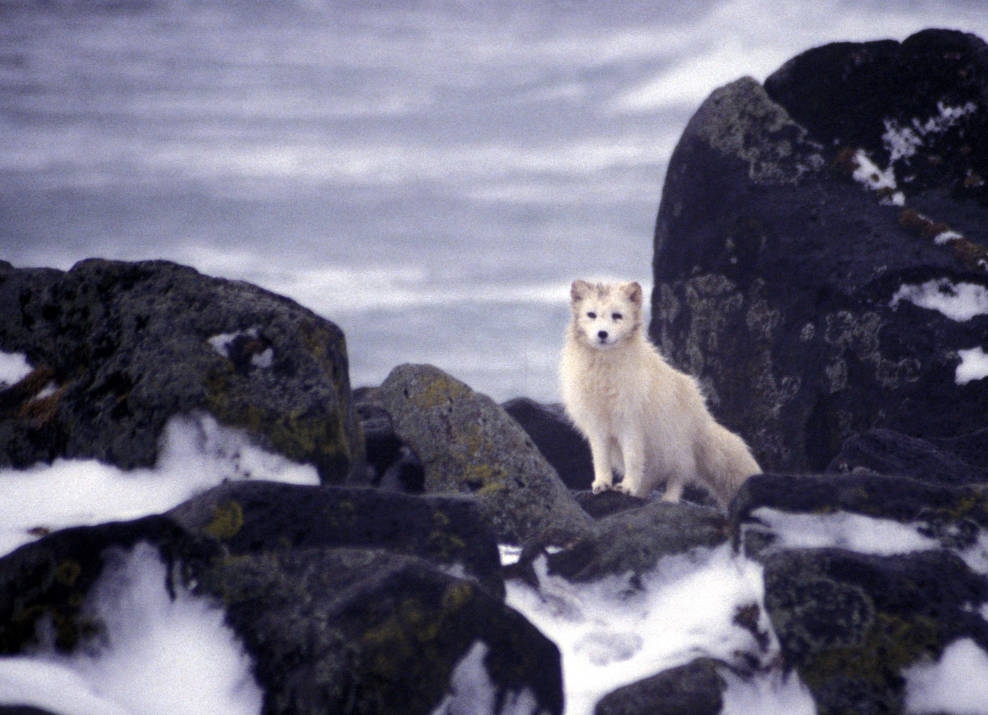 Arctic FoxThe arctic fox is nomadic, it moves from place to place looking for food. In the summer they live in family groups made up of a male, one or two females and the kits. The second female is a leftover kit from the year before, she doesn't breed. She helps care for the young.