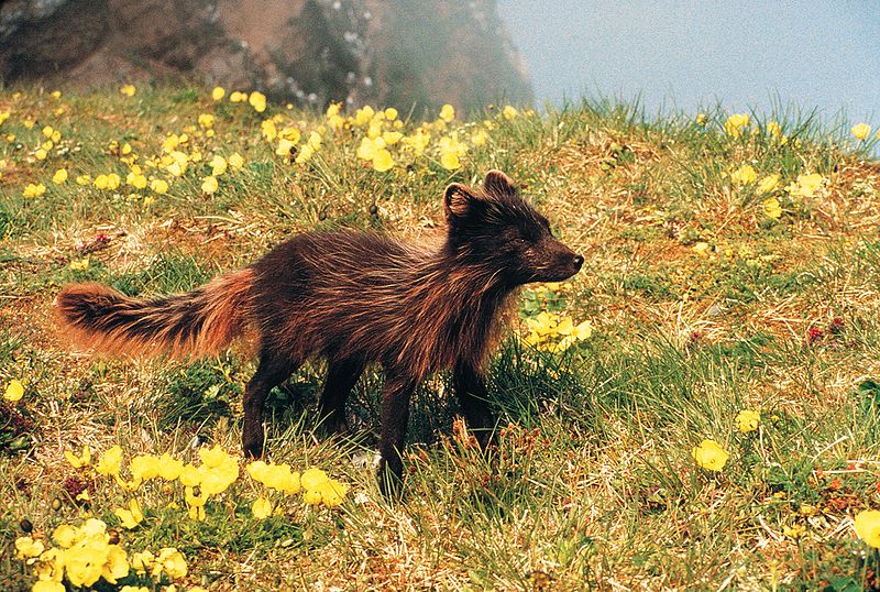 Arctic FoxThe arctic fox is dark gray to brown to bluish-brown in the summer. In the winter, its fur is white or creamy white. It has a long bushy tail, a short nose, and small curled back ears. It has short, stubby legs and thick fur. Its short legs and nose, thick fur, and small ears are adaptations that help it survive in cold climates. Because its legs are so short and its ears and nose are small, there is less of the fox exposed to the cold.