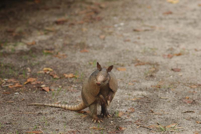 Some people think that the nine-banded armadillo curls itself into a ball when it is frightened. It doesn't! It usually just runs away. Sometimes, when it is startled, it will jump straight up into the air before taking off running. This behavior can cause it to be hit by cars. When a car approaches, the armadillo may leap up and into the oncoming car's bumper. The armadillo can hold its breath for up to six minutes and it sometimes will cross shallow creeks and streams by walking underwater on the bottom to the other side. It also can inflate its intestines to help it swim across the water.