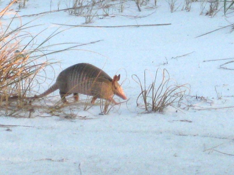 With so little fur, the nine-banded armadillo is very sensitive to temperature. In the winter it is usually active during the warmest part of the day. In the summer it is active at night when it is cooler. If temperatures drop too low, the armadillo can die.