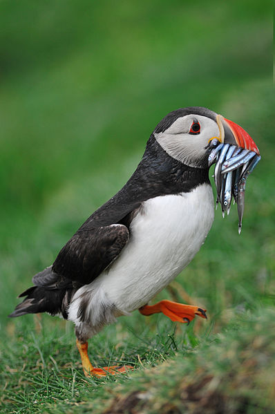 The Atlantic puffin dives for its food and uses its wings to swim underwater. It dives both from the air and from the surface of the water and can dive hundreds of feet under the water in pursuit of prey. It catches small fish, crustaceans, and mollusks and usually swallows them underwater.