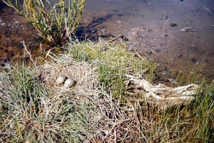 Female avocets lay three to four eggs in a shallow depression lined with grass on the beach or a mudflat. Avocets occasionally nest in colonies. Both the male and the female incubate the eggs and care for the chicks. Avocets can be very aggressive towards intruders while they are nesting. They make loud noises and even dive at intruders to drive them away from the nest!