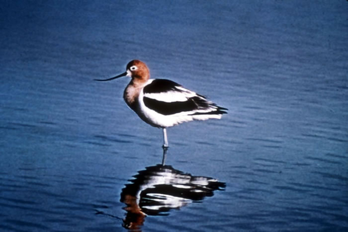 The American avocet is a large shorebird. It is 16-20 inches tall and has very long, grayish-blue legs; a long neck; and a long, turned-up black bill. The female's bill turns up a little more than the male's bill. Its head and neck are rusty-red in the summer and grayish-white in the winter. It has black wings with white stripes and a white body.