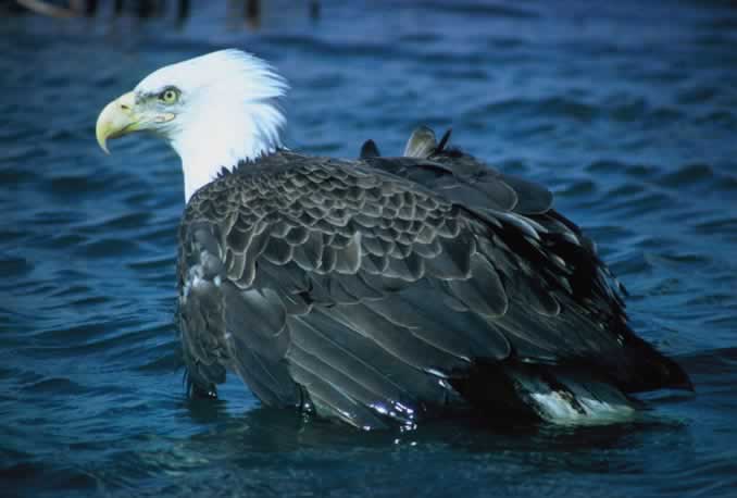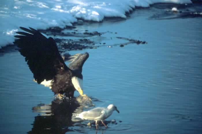 Bald EagleThe bald eagle is a fish eater, although it also eats birds, small mammals, and carrion. It has excellent eyesight and spots its prey from a high perch or from the sky. Once it locates its prey, it swoops down and grabs it in its powerful talons. The bald eagle also steals food from other birds!