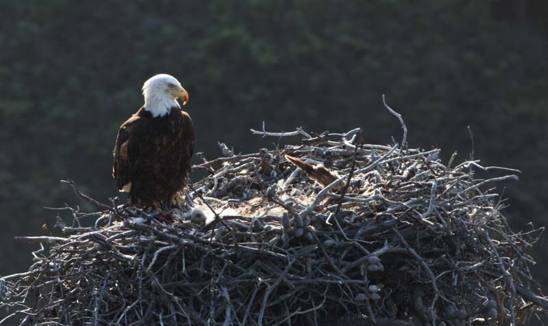 Bald EagleThe female bald eagle lays 2 or 3 eggs in a enormous nest made of sticks placed in a tall tree or sometimes on a cliff top. Bald eagle pairs mate for life and use the same nest year-after-year. They add new sticks each season. Eagle nests can be up to six feet across and eight feet deep and weigh hundreds of pounds!