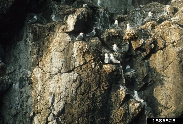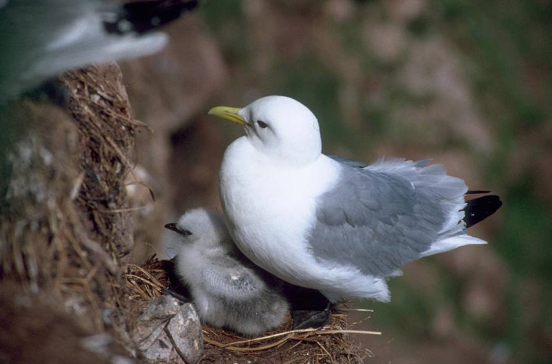 Black-legged KittiwakeThe nest is cup-shaped and made of moss, seaweed, and mud and is placed on the top or side of a cliff or ledge. The female lays 1-3 pinkish-brown eggs. The male and female both incubate the eggs. The chicks hatch in about 27 days. Both parents care for and feed the chicks. The chicks fledge when they are about 40 days old.