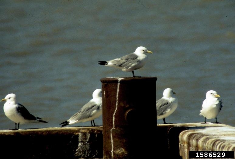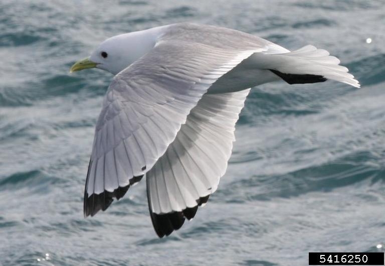 Black-legged KittiwakeThe black-legged kittiwake is a small gull that is 13-18 inches in length with a wingspan of 36 inches. It has white undersides, chest and head; soft-gray upperwings and back and black tips on wings. It has a slightly forked, white tail; a bright yellow bill and black legs and feet with three toes. The name kittiwake comes from its call. Males and females look alike.