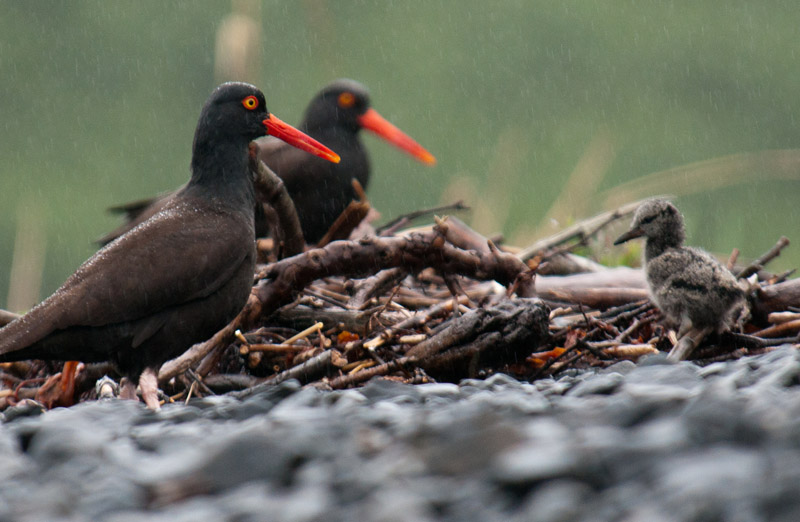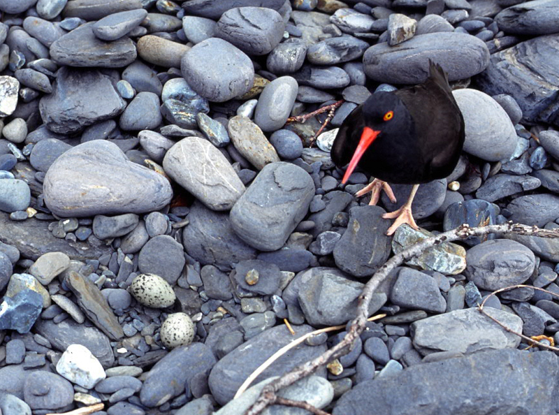 The female black oyster catcher lays two to three eggs among pebbles in a shallow rocky depression or in a hollow on the beach above the high tide line. The nest is built by both the male and the female. They will create a scrape or depression in the ground and then pick up and toss shells and bits of rocks and pebbles into the depression with a backwards or sideways flip of their heads. They use the same nest year-after-year. Both the male and the female take turns incubating the eggs.