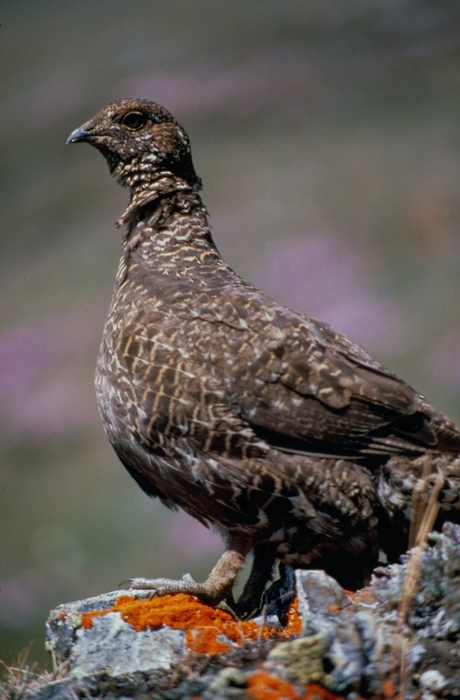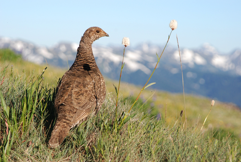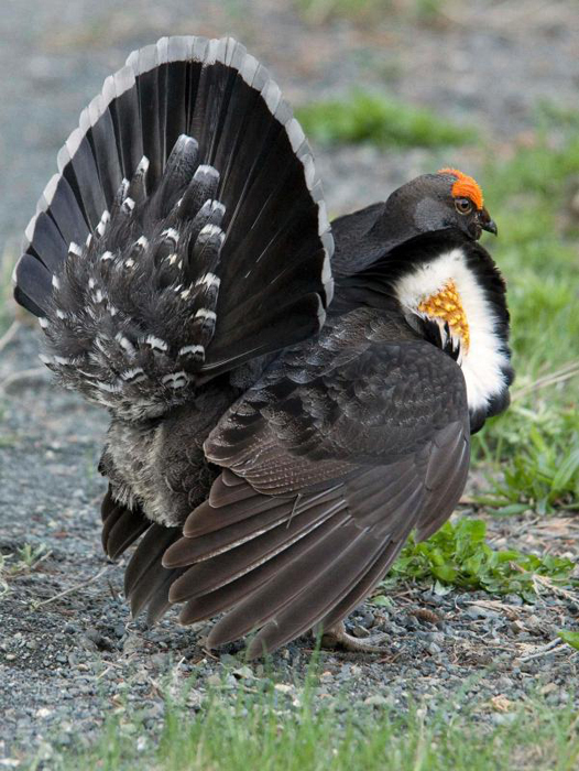 During mating season, the male sooty grouse often perches on a log or post and calls out with a loud booming hoot that can be heard for miles. The comb over his eyes stands up, and he fans out his tail and puffs out his neck to display his neck sac.