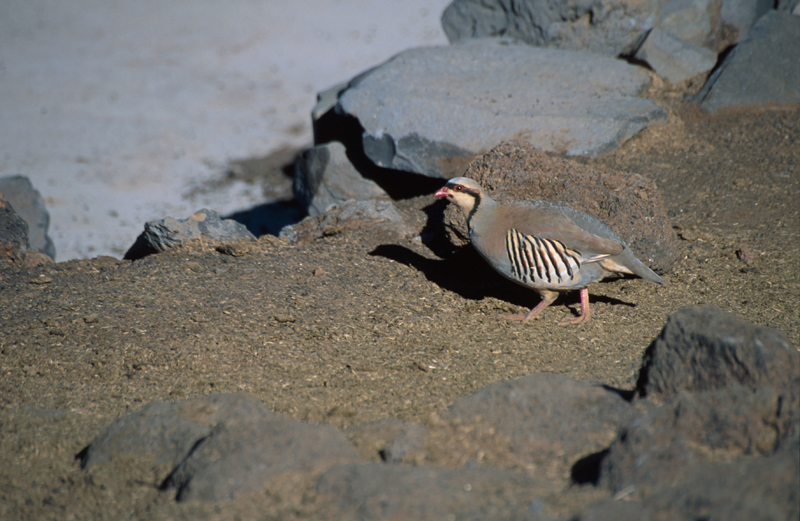 The chukar lives on rocky, arid hillsides and mountain slopes and canyon walls. It is also found in open and flat desert areas with little vegetation and on barren plateaus. It is an altitudinal migrator and will move from higher elevations to lower elevations during snowy weather.