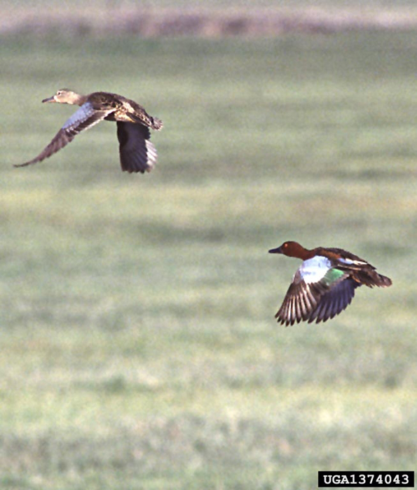 Cinnamon teals travel in small flocks made up of male and female pairs. They are very fast flyers and can take off directly from the water.