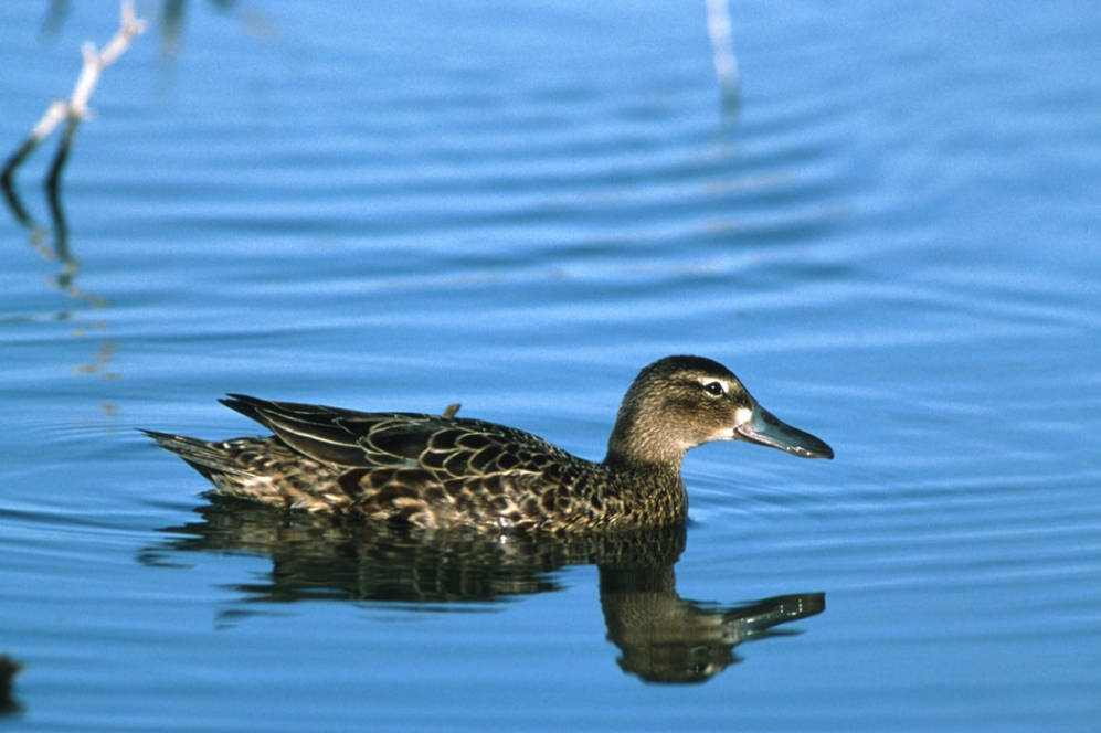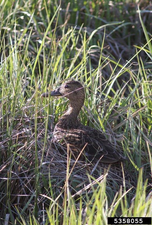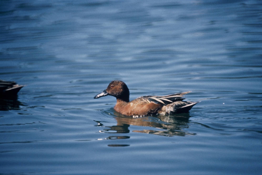 The cinnamon teal is about 14-17 inches long and has a wingspan of about two feet. The female has a light brown head and neck, a gray bill and brown eyes. Her