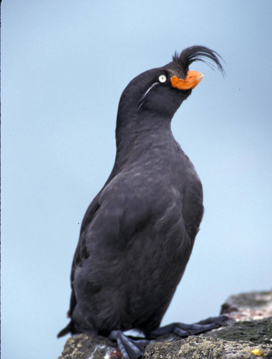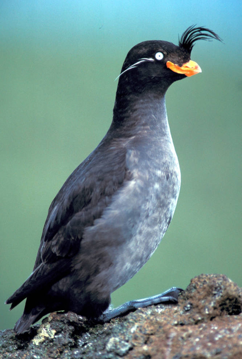 The crested auklet nests in large colonies. The female crested auklet usually lays just one egg in the boulders and crevices in cliffs. The egg hatches in a little over a month. The auklet stores plankton in a pouch under its tongue to feed to the chick. The chick will fledge in a little over a month.