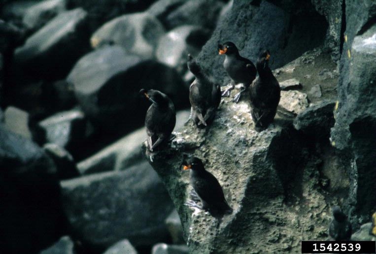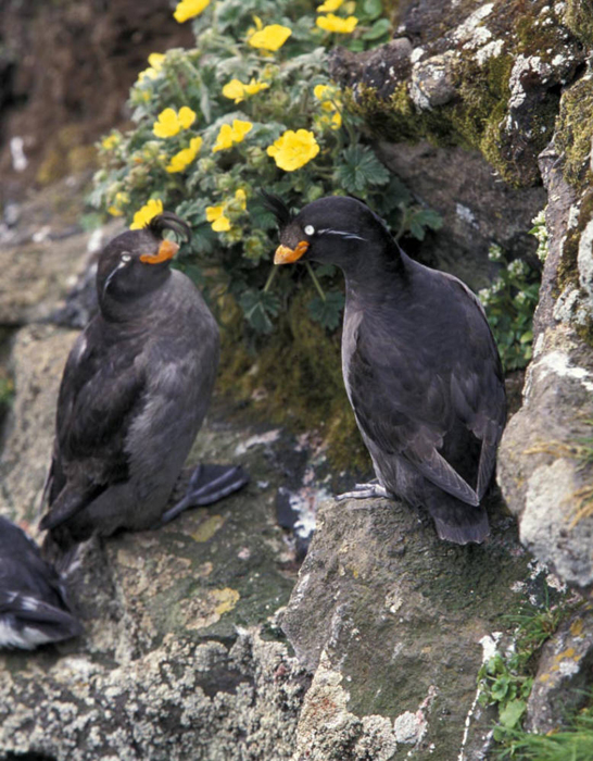 The crested auklet nests on island coasts with lots of rocks and boulders.