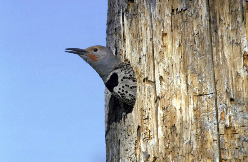 During courtship, flickers peck or "hammer" on dead tree limbs or tin roofs. In some parts of the United States, flickers are known as yellowhammers!