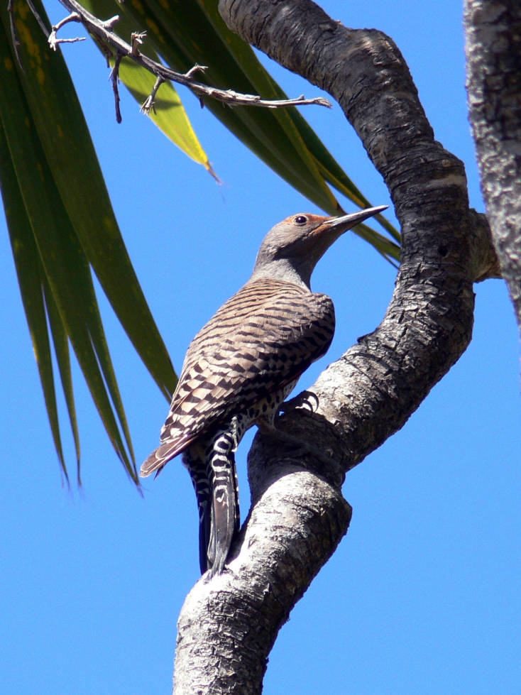 The yellow-shafted flicker has a red patch on its neck and yellow feathers on the inside of its wings. The male has a black mustache. Yellow-shafted flickers can be found in the east and the north. The red-shafted flicker has pinkish feathers on the inside of its wings and the male has a red mustache. The red-shafted flicker is common in the west. The gilded flicker can be found in the deserts of southeastern California and southern Arizona. It has yellow wing linings and the males have a red mustache.