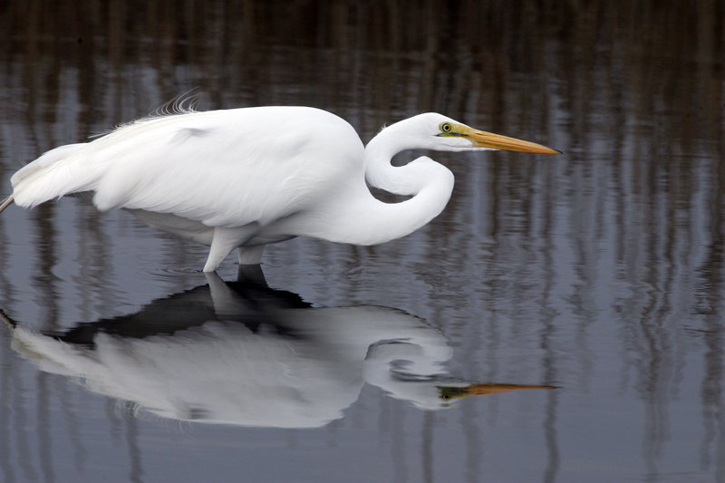 The great egret lives along salt and freshwater marshes, marshy ponds and tidal flats.
