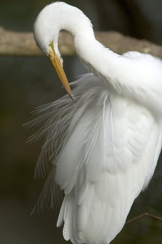 When the great egret is in breeding plumage, it has long lacy and delicate plumes on its back that curl over its tail.