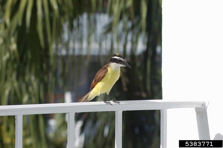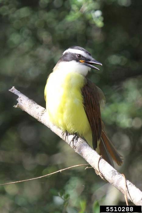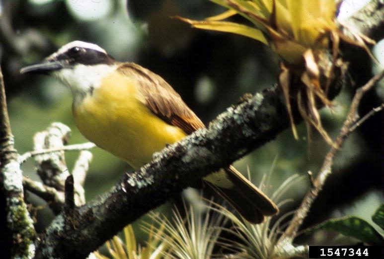 The great kiskadee lives in open woodlands, streamside thickets, groves, orchards and parks.