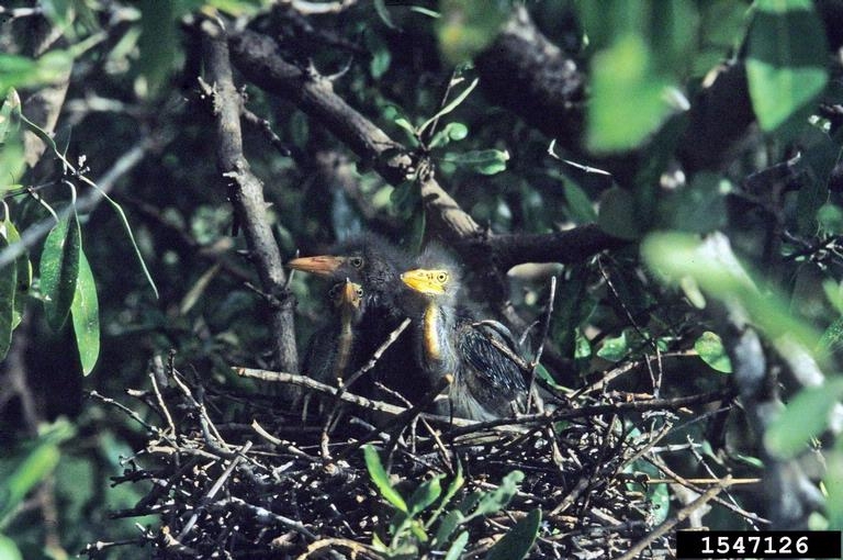 The female green heron lays three to six eggs in a nest made of sticks. Both the female and male make the nest. The male gathers the materials and the female constructs the nest. The nest is built in a tree, in a dense thicket, or occasionally, in the reeds or cattails in a marsh or in an orchard.
