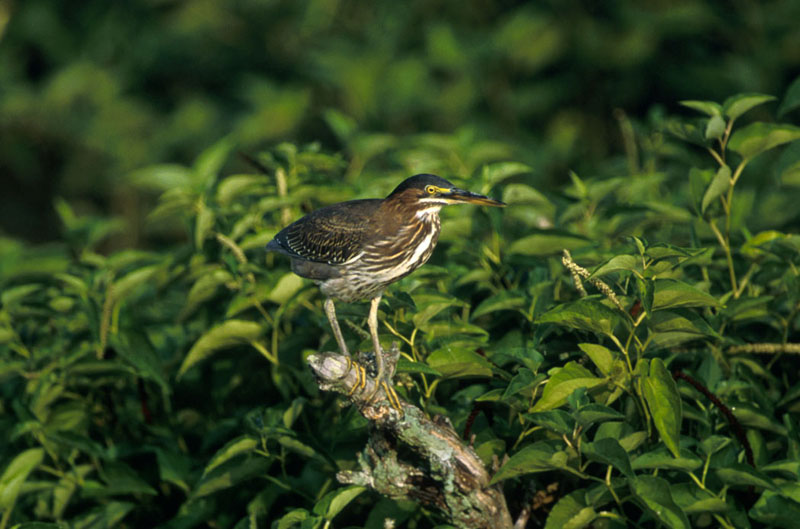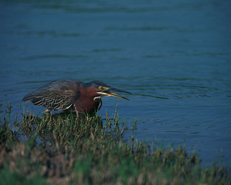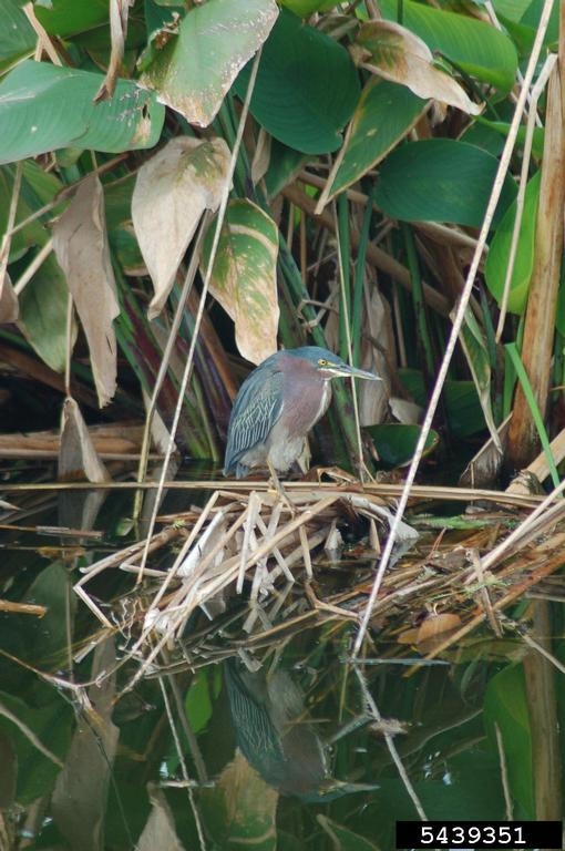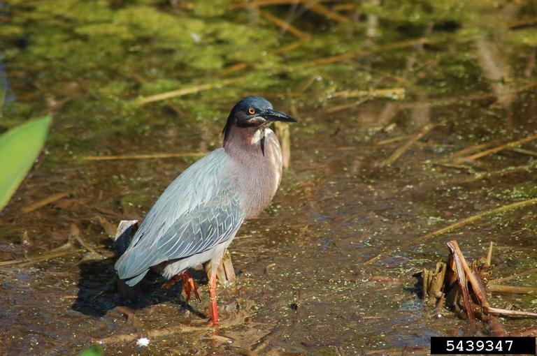 The green heron lives in freshwater or brackish water marshes with clumps of trees.