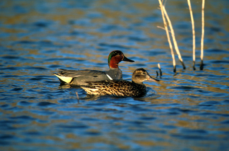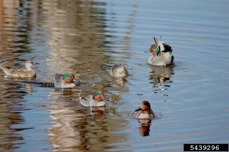 The green-winged teal is an early migrant. They migrate in large flocks and often fly low over water, wheeling and turning together. Males migrate first. Green-winged teals migrate both during the day and at night. |