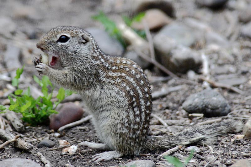 The Mexican ground squirrel is omnivorous and feeds during the day. Its diet includes seeds, nuts, grains, roots, bulbs, plant stems, leaves, mice, insects and eggs. It often stores seeds, grains and nuts in its cheeks pouches and takes them back to its den to eat later. In the spring most of its diet is plant matter. In the summer it eats insects. It also eats carrion and is often seen eating roadkill on the highway.