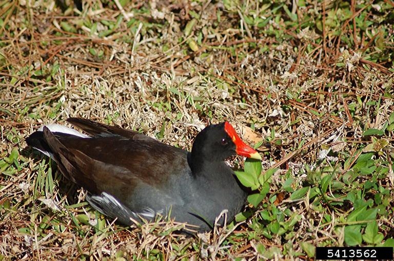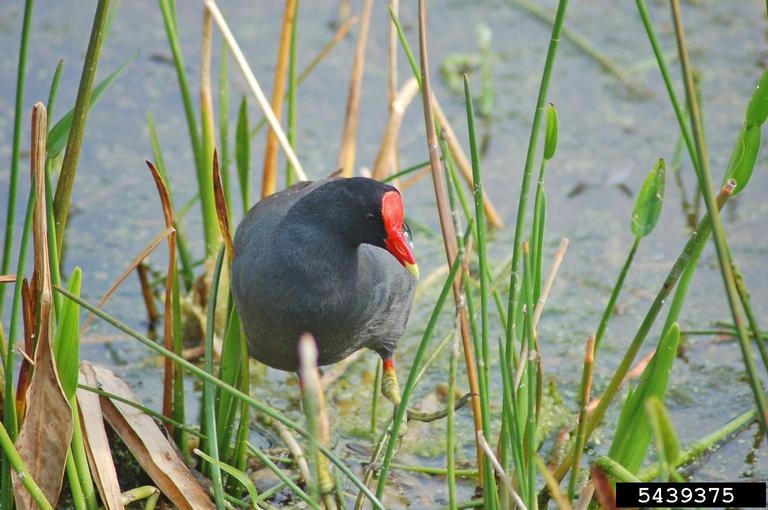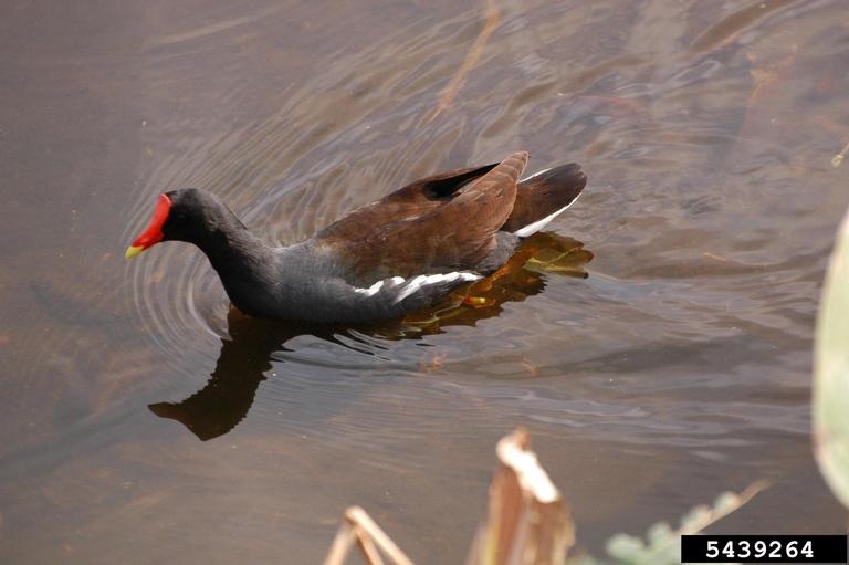 The common moorhen is a meduim-sized member of the rail family found in aquatic environments. It is 12-15 inches in length and has a wingspan of a little under two feet. It has gray-black feathers and a red bill with a yellow tip. It has white stripes on its sides. It has long chicken-like toes that help it walk on the top of floating vegetation and the mud. Males and females are similar, but males are a little larger.