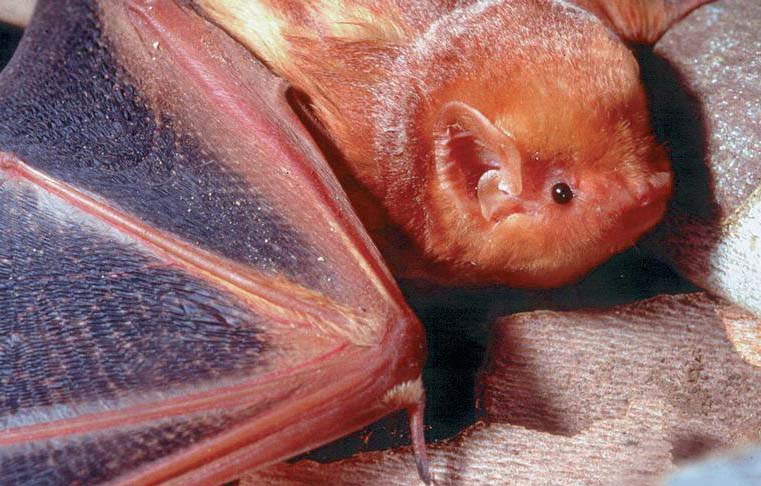 Eastern Red BatThe eastern red bat is a tree bat. It is 3½ to 4½ inches in length with a wingspan of about 13 inches. It has small, rounded ears and long and silky fur that can be red to a golden brown. It has white shoulder patches and its fur has a white tip that gives it a frosted look. Males are redder in color than females.