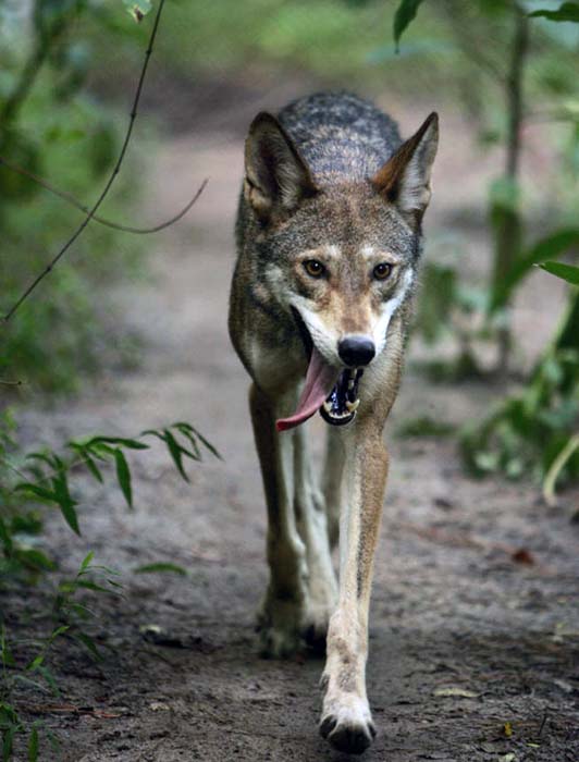 The red wolf makes its home in swamps, forests, and coastal plains.
