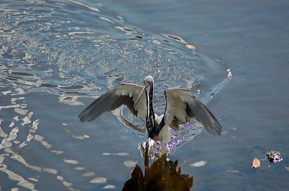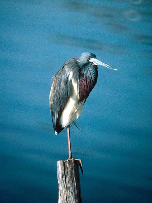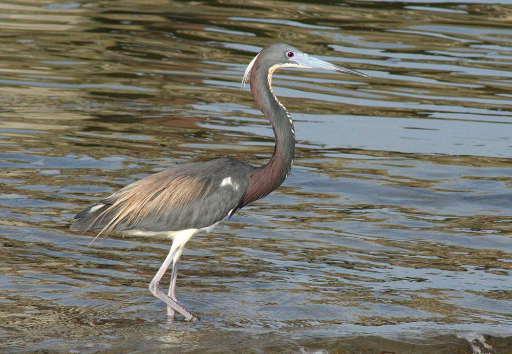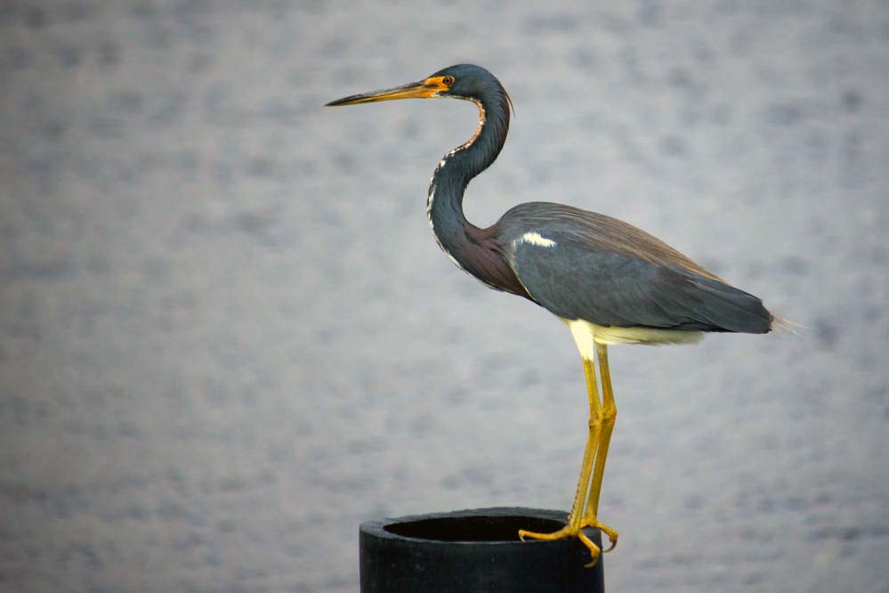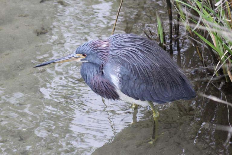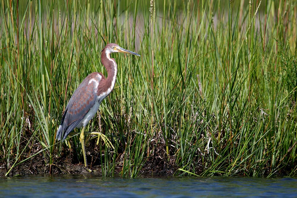 The tricolored heron can be found in marshes, swamps, bayous, mudflats, lagoons and coastal ponds.