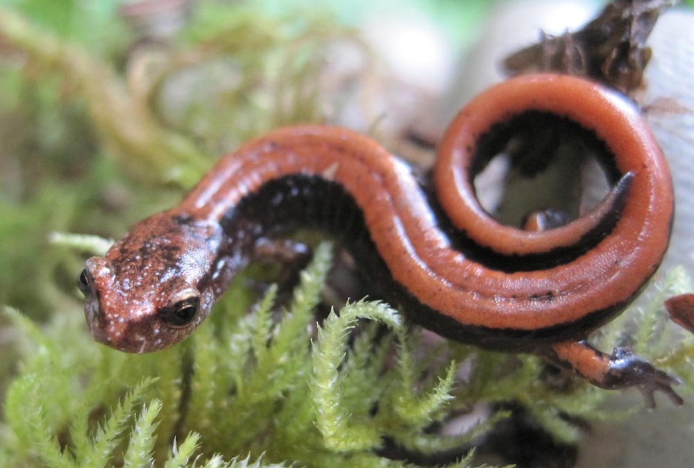 The western red-backed salamander can be found under rocks and fallen wood, along stream banks and in shady forests.
