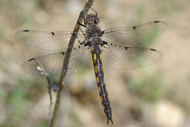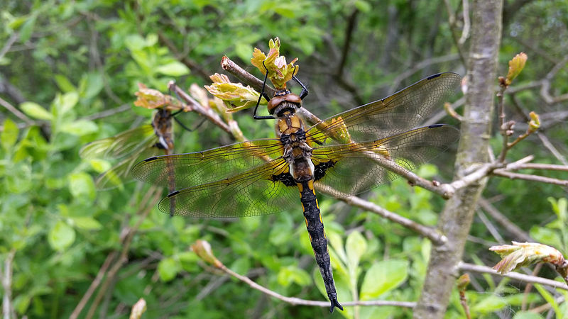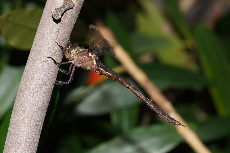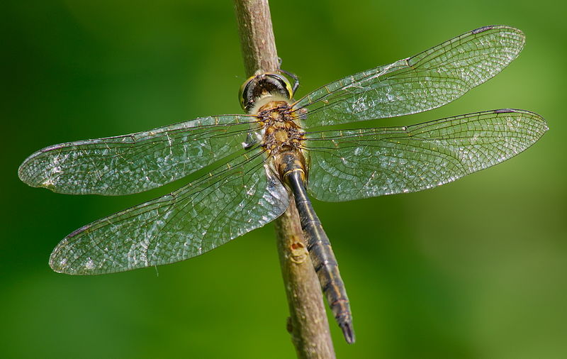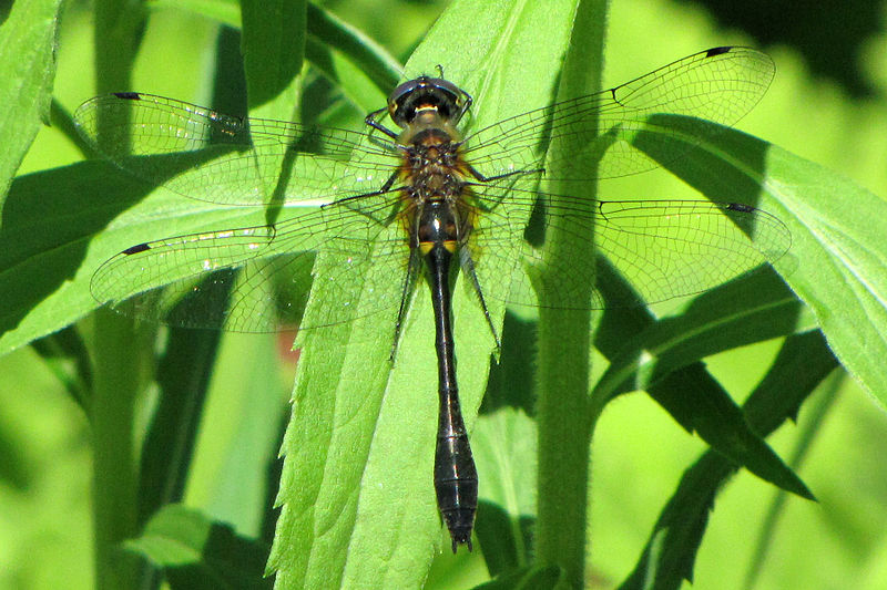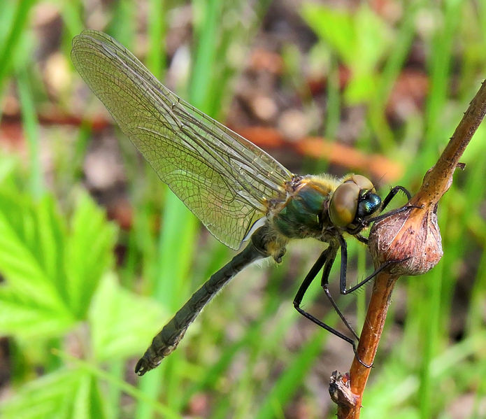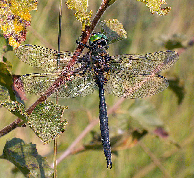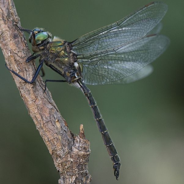 The dragonflies in this family are large, usually between 1.5 and 3 inches in length. They have bright green eyes, and many species are black with metallic green or yellow markings.