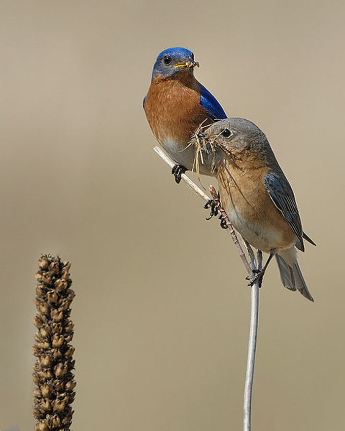 Breeding occurs in the spring and summer. The Eastern Bluebird builds its nest in a tree cavity or a man-made nest box. The female builds the nest by weaving together grasses and pine needles and lines the nest with fine grasses and soft, downy material. She may use this nest several times. The female lays 3-7 light blue eggs, which she incubates for 13-17 days. Young chicks leave the nest 15-20 days after hatching. Both the male and female feed the young insects. The Eastern Bluebird can live for 6-10 years.