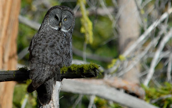 The Great Gray Owl is found in dense, coniferous forests in Canada and in mountain forests in the western United States. It prefers to make a nest in large, old pine and fir trees in spots far from human development. In the winter, the Great Gray Owl may live on the edge of woodlands, bordering open fields on which to hunt. It may also live near brackish tidal meadows. |