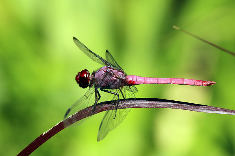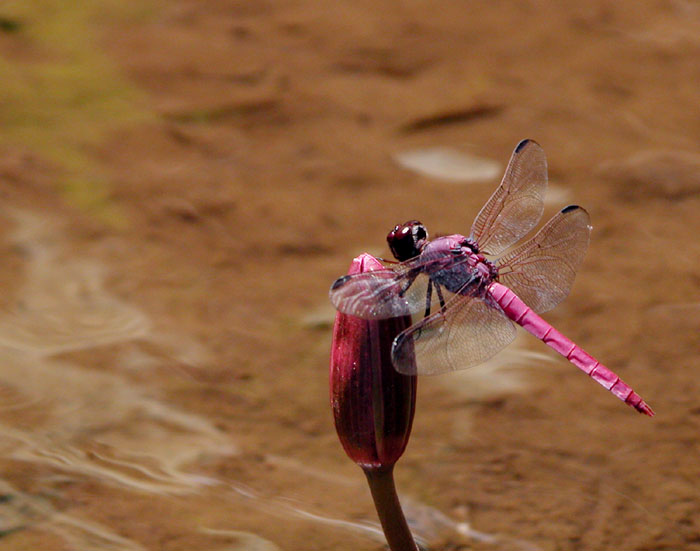 The roseate skimmer is found near ponds and quiet water. Males are have a lavender pink abdomen, feamles are yellow-to-golden brown.