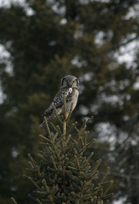 The Northern Hawk Owl lives in northern coniferous forests. It prefers a habitat on the edge of a clearing such as a muskeg (bog), or mountain range. While perched in a tree, the Northern Hawk Owl can hunt in the cleared area.