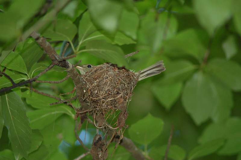 The female lays 2-4 eggs in a open cup nest woven of plant fibers and placed in a bush or tree, sometimes over a stream. The chicks hatch in two weeks and fledge when they are 13-15 days old. The female may have two broods a year.