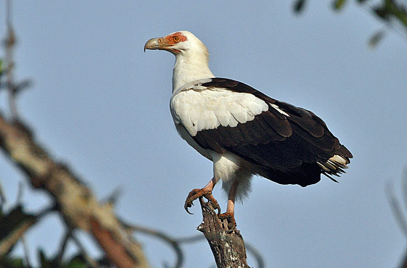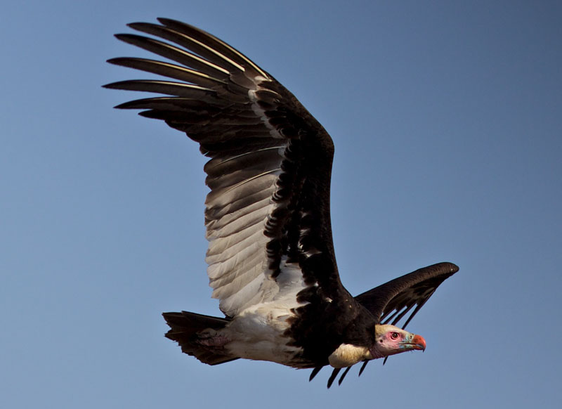 The white-headed vulture has a bare, pink face and a bright orange-red bill with a blue base.