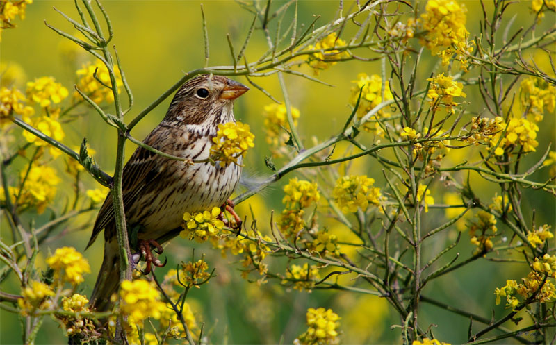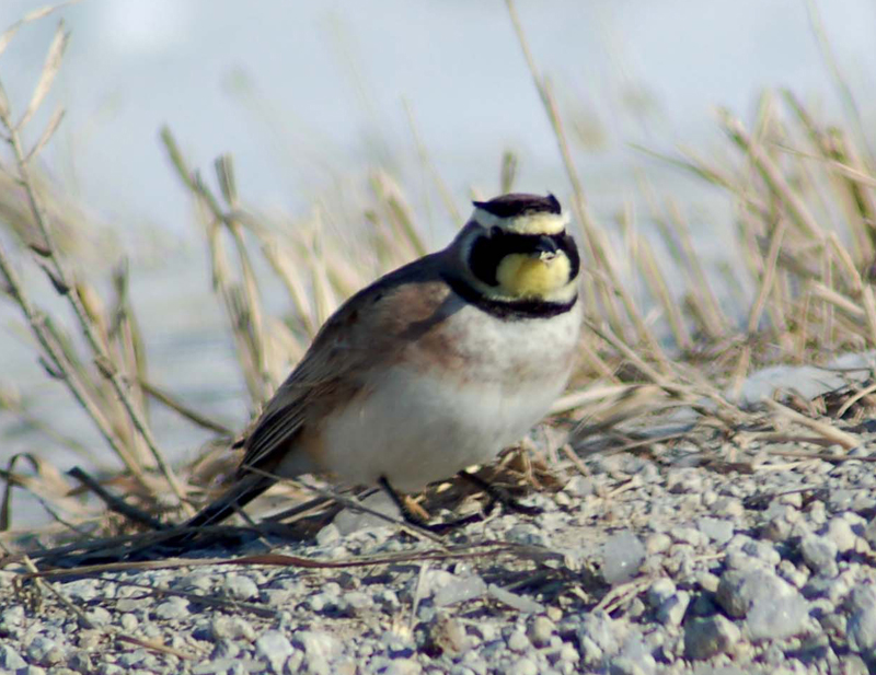 The horned lark is found throughout North America. It is also found in Asia and Europe. It lives in open areas like prairies, fields, and the tundra. The horned lark is about seven inches in length. It is brown on its uppersides and white on its belly. It has a black neck patch and a black mask on its face. It gets its name from the tufts of feathers on its head that look like horns.