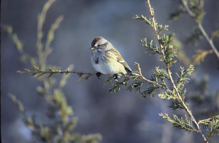 The American tree sparrow migrates at night. There is no overlap between its breeding grounds and its winter territory.