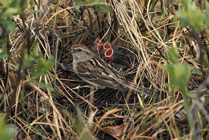 The male American tree sparrow arrives at the breeding grounds first. He aggressively protects his territory. The female lays 4-6 eggs in a cup-shaped nest made of sticks, grass, and moss. The nest is made on the ground. The female incubates the eggs. Incubation takes about 12 days. Both the male and female care for and feed the chicks. The chicks fledge when they are about two weeks old, but they continue to be fed by their parents for a few more weeks. Most American tree sparrows live two to three years in the wild.