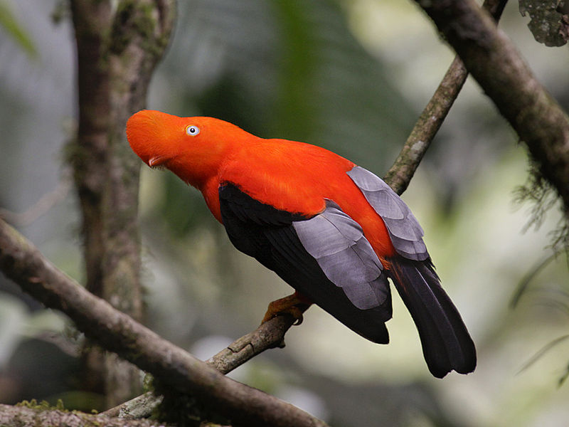 The Andean cock-of-the-rock is found in humid, rocky forested areas and is often found in ravines near water or by forest streams. It is usually found at elevations of 1,500-8,900 feet.