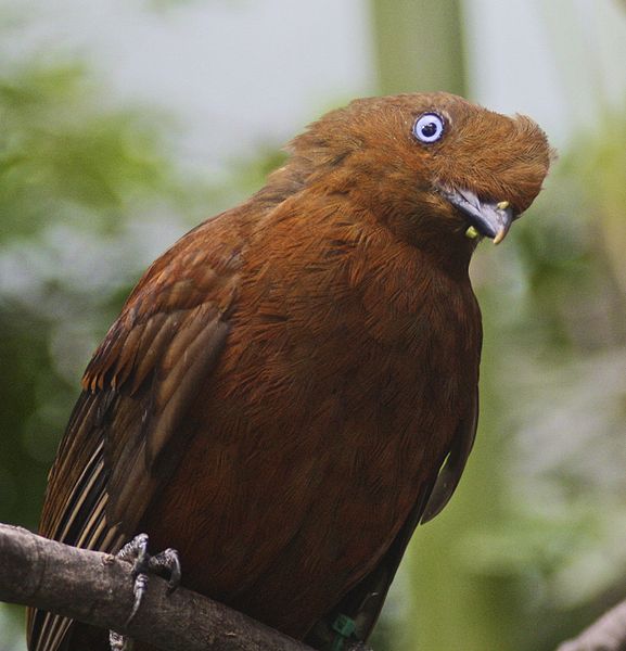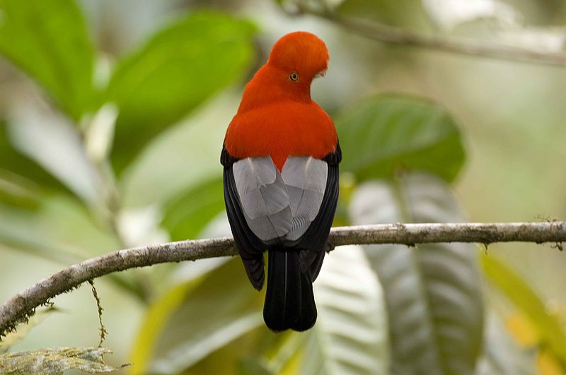 The Andean cock-of-the-rock is the national bird of Peru. It is a medium-sized perching bird around 12 inches in length. The male Andean cock-of-the-rock has a bright red-orange head, neck, breast, and shoulders. It has a black body, gray wings, and a large disk-shaped crest of feathers that extends over its bill. The female is a brownish-orange over her whole body and has a smaller crest.