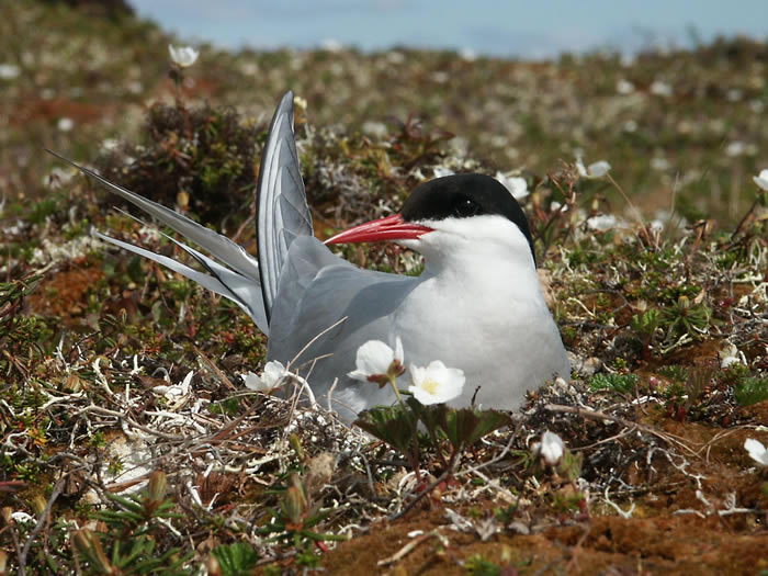 The Arctic tern flies 30-40 feet over the water and then dives into the water to catch small fish and crustaceans. It also eats insects. | |
